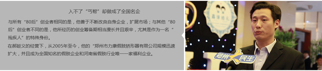 鄭州市力康假肢矯形器有限公司(簡稱力康),是一家專業從事假肢矯形器的設計、研發、制作及裝 配的專業機構。成立于1992年是河南省唯一一家福利企業。力康下設業務部、技術部、住院部、康復 部、售后服務部,并配有現代化的裝配車間和功能齊全的訓練大廳,為殘疾朋友康復訓練提供了可靠 保障??偨浝泶┐骷僦嗄辏兄S富的臨床經驗和親身體會;多年來,力康已為全國幾十萬名殘疾 朋友安裝上舒適、美觀、耐用的假肢和矯形器具,使他們更大限度地恢復了正常的工作和生活。“產 品即人品”的質量理念、先進的技術、實惠的價格、完善的售后服務是力康取勝的法寶……